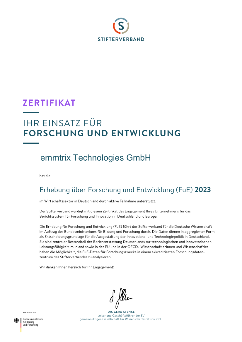 Our company has been awarded a certificate by the Stifterverband for active participation in the 2023 Research and Development (R&D) Survey.