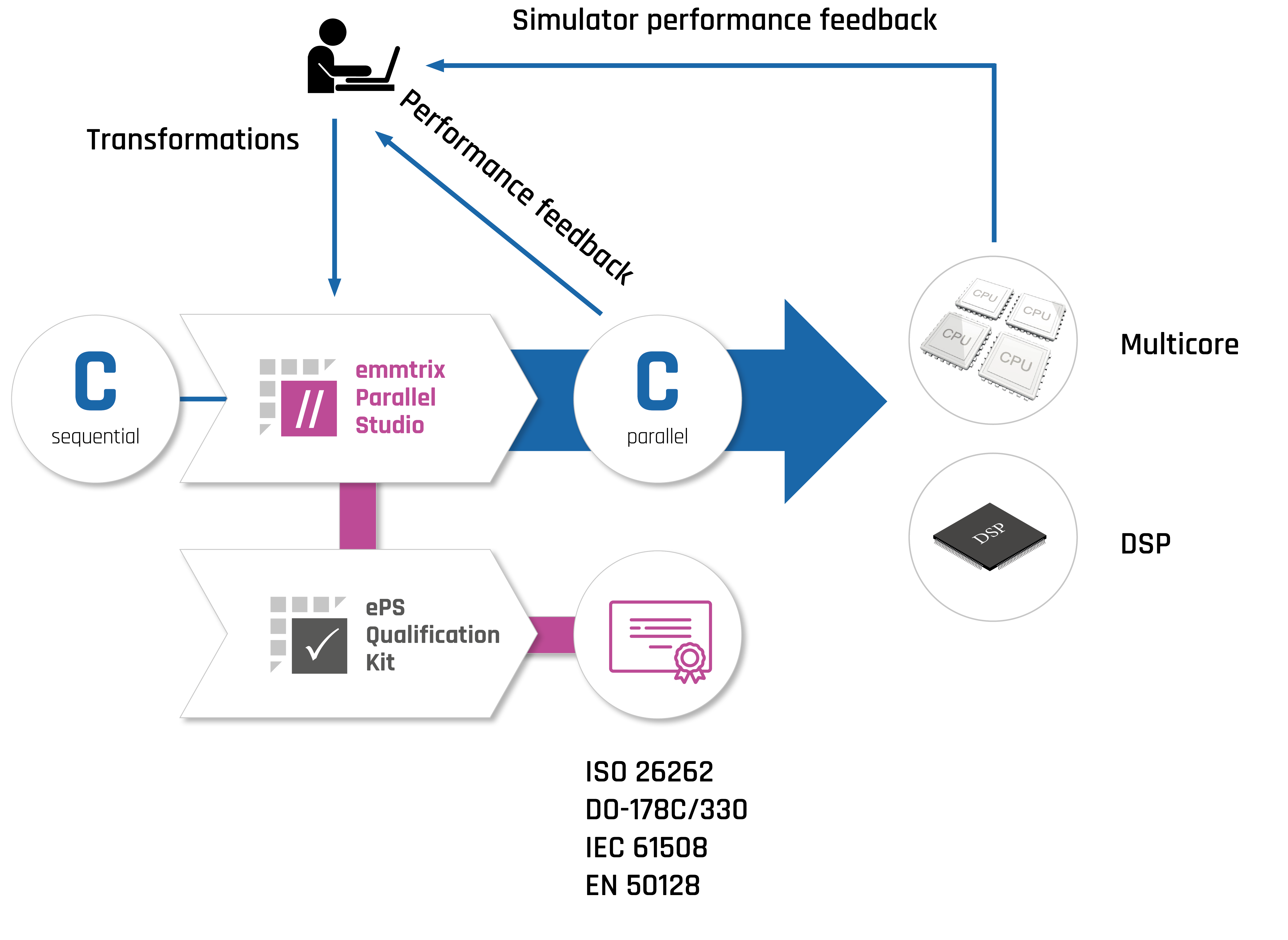 Use your existing C code as starting point for the parallelization in ePS. Together with ePS Qualification Kit the parallelization can be performed for applications with functional safety requirements like ISO 26262 or DO-178C.