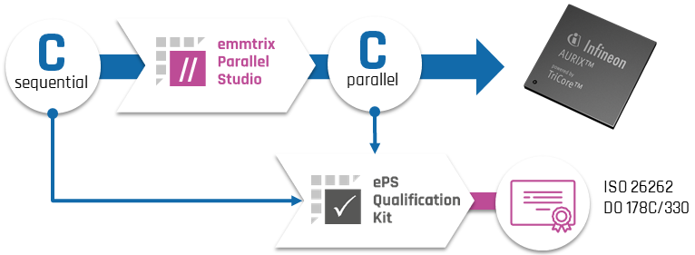 The emmtrix Qualification Kit for emmtrix Parallel Studio (ePS-QKIT) provides the tools and processes required for the safety qualification of emmtrix Parallel Studio according to DO-178C/330, ISO 26262 and comparable functional safety standards. This enables the use of our parallelization technology for safety-critical software of the highest safety levels. The QKIT is based on a verification tool that checks whether the sequential software (input) and the parallelized software (output) behave in exactly the same way.